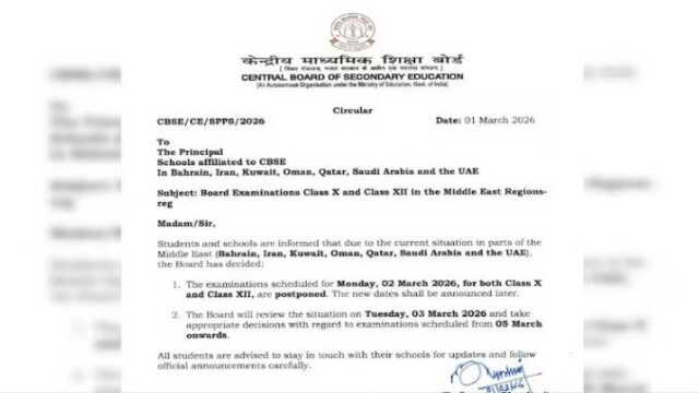 ନୂଆଦିଲ୍ଲୀ: କେନ୍ଦ୍ରୀୟ ମାଧ୍ୟମିକ ଶିକ୍ଷା ବୋର୍ଡ (CBSE) ମଧ୍ୟପ୍ରାଚ୍ୟର ପରିସ୍ଥିତି ଯୋଗୁଁ ମାର୍ଚ୍ଚ ୨ରେ ହେବାକୁ ଥିବା ଦଶମ ଏବଂ ଦ୍ୱାଦଶ ଶ୍ରେଣୀ ବୋର୍ଡ ପରୀକ୍ଷାକୁ ସ୍ଥଗିତ ରଖିଛି। ବୋର୍ଡ କହିଛି ଯେ ନୂତନ ତାରିଖ ପରେ ଘୋଷଣା କରାଯିବ।