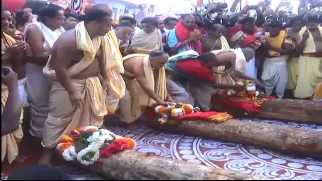 ପୁରୀ: ପବିତ୍ର ଅକ୍ଷୟ ତୃତୀୟରେ ମହାପ୍ରଭୁଙ୍କ ରଥ ନିର୍ମାଣ କାର୍ଯ୍ୟର ଅନୁକୂଳ ହେଲା । ଶ୍ରୀମନ୍ଦିର ପ୍ରଶାସନ କାର୍ଯ୍ୟାଳୟ ସମ୍ମୁଖରେ ତିନିଟି ୧୨ ଫୁଟିଆ ଧଉରା କାଠକୁ ବାରିକେଡ ଘେରାଇ ରଖାଯାଇଥିଲା । ଶ୍ରୀମନ୍ଦିର ପୁରୋହିତ, ରାଜଗୁରୁ ଓ ଶୋତ୍ରୀୟ ବ୍ରାହ୍ମଣମାନେ ବନଯାଗ ବିଧିରେ ପୂଜା ସମ୍ପାଦନା କରିଥିଲେ । ତନ୍ତ୍ରବିଧି ଅନୁସାରେ ମହାକାଳୀ ମନ୍ତ୍ରରେ ପୂଜିତ ହୋଇଥିଲା କୁରାଢ଼ି । ଅପରାହ୍ନ ୫ଟା ୩୦ ପରେ ତିନି ଜଣ ପୂଜାପଣ୍ଡା ସାମନ୍ତ ୩ଟି ଆଜ୍ଞାମାଳ ଧରି ଆସିଥିଲେ । ମନ୍ତ୍ର ଧ୍ୱନି ମଧ୍ୟରେ ବିଶ୍ୱର୍କମାମାନେ ପାରମ୍ପରିକ ରୀତିନୀତିରେ ଉକ୍ତ କାଠରେ ରଥ ନିର୍ମାଣର ଶୁଭାରମ୍ଭ କରିଛନ୍ତି ।