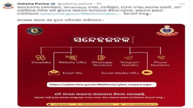 ‘ଏକ୍ସ’ରେ ଓଡିଶା ପୋଲିସ୍ ପକ୍ଷରୁ କୁହାଯାଇଛି ଯେ କୌଣସି ସନ୍ଦେହଜନକ ୱେବସାଇଟ୍, ହ୍ଵାଟ୍ସଆପ୍ ନମ୍ବର, ଟେଲିଗ୍ରାମ, ଫୋନ ନମ୍ବର,ଇମେଲ ଆଇଡି, ଏବଂ ସୋସିଆଲ୍ ମିଡିଆ ଭଳି ସ୍ଥାନରେ ସାଇବର ଅପରାଧର ଶୀକାର ହେଲେ, ସାଇବର କ୍ରାଇମ ପୋର୍ଟାଲରେ ରିପୋର୍ଟ କରନ୍ତୁ ।