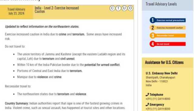 ସୂଚନା ଅନୁଯାୟୀ, ଆମେରିକାର ବୈଦେଶିକ ବିଭାଗ କହିଛି ଯେ ଆତଙ୍କବାଦ ଓ ନାଗରିକ ଅଶାନ୍ତି କାରଣରୁ କେନ୍ଦ୍ରଶାସିତ ଅଂଚଳ ଜମ୍ମୁ ଓ କଶ୍ମୀରରେ ଆକ୍ରମଣ ଆଶଙ୍କା କାରଣରୁ ଭାରତ-ପାକିସ୍ତାନ ସୀମାର ୧୦ କିଲୋମିଟର ଭିତରେ ନକ୍ସଲବାଦ, ଉଗ୍ରବାଦ କାରଣରୁ ମଧ୍ୟ ଓ ପୂର୍ବ ଭାରତର କିଛି ଅଂଚଳରେ ହିଂସା ଓ ଅପରାଧ କାରଣରୁ ମଣିପୁର ଯାତ୍ରାରୁ ଦୂରେଇ ରହିବା ଆବଶ୍ୟକ।