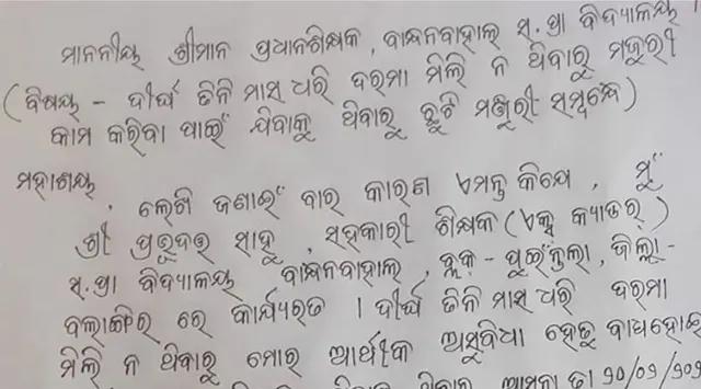 ସୂଚନା ଅନୁସାରେ, ବଲାଙ୍ଗୀର ଜିଲ୍ଲାର ପୁଇଁତଲା ବ୍ଲକର ବାନ୍ଧନବାହାଲ ପ୍ରାଥମିକ ବିଦ୍ୟାଳୟରେ ସହକାରୀ ଶିକ୍ଷକ (ପୂର୍ବ କ୍ୟାଡର) ଭାବରେ କାର୍ଯ୍ୟ କରୁଥିବା ଜଣେ ଶିକ୍ଷକ ପ୍ରଭୁଦତ୍ତ ସାହୁ ଗତ ବୁଧବାର ଦିନ ସରକାରୀ ଶିକ୍ଷାନୁଷ୍ଠାନର ପ୍ରଧାନ ଶିକ୍ଷକଙ୍କୁ ଏକ ଛୁଟି ଆବେଦନ ଦାଖଲ କରିଥିଲେ । ଯାହାକୁ ନେଇ ଚାରିଆଡେ ଚର୍ଚ୍ଚା ଆରମ୍ଭ ହୋଇଥିଲା । ପ୍ରଭୁଦତ୍ତ ଦରଖାସ୍ତରେ ଆବେଦନ କରିଥିଲେ ଯେ, ଗତ ତିନି ମାସ ଧରି ଦରମା ନ ପାଇବା ପରେ ତାଙ୍କର ଆର୍ଥିକ ଅବସ୍ଥା ଖରାପ ଆଡକୁ ଗତି କରୁଛି । ତେଣୁ ତାଙ୍କୁ ମୂଲ ଲାଗିବା ପାଇଁ ଫେବୃଆରୀ ୨୦ ତାରିଖ ଦିନକୁ ଛୁଟି ପ୍ରଦାନ କରାଯାଉ । ଯାହାକୁ ପ୍ରଧାନ ଶିକ୍ଷକ ମଞ୍ଜୁର ମଧ୍ୟ କରିଥିଲେ ।
