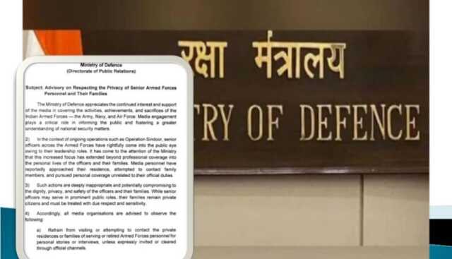 ସେନା କର୍ମଚାରୀଙ୍କ ବ୍ୟକ୍ତିଗତ ତଥ୍ୟ ଯେପରିକି ବାସସ୍ଥାନ ଠିକଣା, ପରିବାର ସଦସ୍ୟଙ୍କ ଫଟୋ ନେବା ଠାରୁ ଦୂରେଇ ରହିବାକୁ ପରାମର୍ଶ ଦେଇଛି ପ୍ରତିରକ୍ଷା ମନ୍ତ୍ରଣାଳୟ । ଜାତୀୟ ସୁରକ୍ଷାକୁ ଦୃଷ୍ଟିରେ ରଖି ଏସମ୍ପର୍କିତ ଗୋପନୀୟତା ରକ୍ଷା କରିବା ପାଇଁ ଗଣମାଧ୍ୟମକୁ ଦାୟିତ୍ୱପୂର୍ଣ୍ଣ ସାମ୍ବାଦିକତାର ମାନଦଣ୍ଡ ବଜାୟ ରଖିବାକୁ ଆଡଭାଇଜରୀରେ କୁହାଯାଇଛି ।